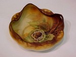 A SUPERB NIPPON HAND PAINTED CHESTNUT BOWL: Hand painted basket and leaf motif centering a slightly raised image of a chestnut. Exaggerated ruffle edge, pierced handles, rub marks to the exterior. Green Morimura Bros. mark. 9 1/2" dia. | 130 |