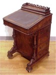 VICTORIAN RENAISSANCE BURL WALNUT INLAID DAVENPORT DESK: Hinged stationery compartment with a three quarter pierced gallery, above sloping lid inset with leather, both with satin and king inlay, sloping hinged top enclosing four small drawers, over four real and four opposing dummy drawers, spool and twist turned columns, 20 1/2" x 21" x 35"h. | 1,400 |