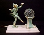 ART DECO FIGURAL LAMP: Dancing harlequin on a beveled white marble base. Lamp house a control bubble paperweight that looks great under illumination, but will hold a globe shade. Approx. 9"h, 10"l. | 225 |