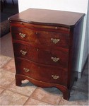 EARLY 20TH C ENGLISH CHIPPENDALE STYLE SERPENTINE FRONT CHEST: Diminutive 3 drawer chest with pull out tray. 36"w. 24"h. Sold with burled and shaped beveled mirror, 40"h. From the estate of Elton Hoyt II. | 600 |