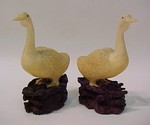TWO ASIAN CARVED IVORY GEESE: Pair of artist signed geese on custom carved wooden stands. Each goose is 5 1/4"h, 4 1/2"l, the stands add an additional 2". Please note age cracks through both pieces. From the estate of Elton Hoyt II. | 400 |