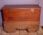 CARVED TEAK MADURA CHEST, CA. 1900: Used to keep the family valuables, hence bells ring when lock is used. Wheels hidden under an elaborately carved frieze. 35"h. x 45" x 20"deep. | 400 |