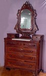 EARLY VICTORIAN MAHOGANY CHEST: Two over three drawer chest topped by two glove boxes flanking pedestal mirror in ornately carved frame with shaped cornice, flame grain panels to drawer fronts, top centered by inset rectangle of variegated light grey marble, lovely foliate scroll escutcheons and bead trim to drawers, pinwheel carving to pulls, 42 1/2"w. x 18"d. x 82"h. | 350 |
