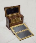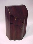 ENGLISH REGENCY KNIFE BOX: Mahogany with striped inlay, serpentine front, slanting top. Brass escutcheons and knob handle. Worn condition. 12 3/4"h., 8" wide, 5" deep. From the estate of Elton Hoyt II. | 250 |