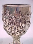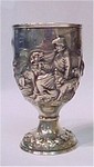 EMBOSSED ENGLISH STERLING SILVER GOBLET: London maker J.R. Hennell, 1879/1880, marked Thornhill New Bond St London, embossed with scene of hunter, his dogs and the fruits of their labor, stylized monogram under a heraldic dog, floral decoration to base, 5 5/8"h., approx. 7.44oz. From the estate of Elton Hoyt II. | 700 |