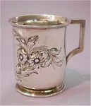 EMBOSSED COIN SILVER MUG: Purchased from Mulford & Wendell Albany New York, marked J.C.M. 22, embossed in a lovely floral motif, monogrammed to James H Hoyt 1853, approx. 3 7/8"h. x 3 3/8"dia. From the estate of Elton Hoyt II. | 275 |