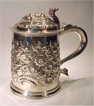 PERIOD QUEEN ANNE ENGLISH STERLING SILVER TANKARD: Silver tankard from London maker (possibly Lawrence Jones), 1711/1712 with traditional S handle ending in shield, volute thumb lever to lid, WITH later chased floral embossing, monogrammed to bottom H over W M over 1751. Approx. 7 1/4"h., 7 1/4"w. including handle, raised rim base 4 3/4"dia., holds 40 oz., weight approx. 22.40 oz. | 1,500 |