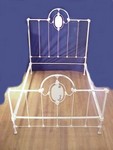 FULL SIZE WHITE IRON BED: Thin rods centering an oval medallion on head and foot board. Headboard is 63 1/2"h. | 225 |