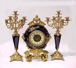 JAPE FRERES PORCELAIN CLOCK AND GARNITURE: Open escapement, porcelain dial, bell strike. Gilt metal mounted clock of cobalt porcelain with heavy gilt accents. Lion's head masquerons at the sides. 5 light candle holder garniture, 16"h. Clock case is 15"h. | 350 |