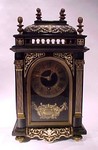 EBONY BRACKET CLOCK INLAID WITH IVORY: Metal mounted petite clock with Roman numerals on brass face. Glass front and sides. 11" x 6" x 4". | 600 |