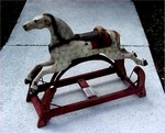 EARLY PLATFORM ROCKING HORSE, CA. 1905: Horse hair tail and mane on wooden horse with worn white painted finish. Worn leather saddle, little iron horse shoes on the back hooves, big glass eyes. Length of horse is 37", 29"h, overall. Consigned from original owner. | 800 |