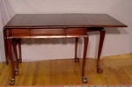 "OLDE MEETING HOUSE" SOLID MAHOGANY DROP LEAF TABLE WITH LEAF: Queen Anne style with shaped apron and ball and claw feet. 23" wide without the leaf. With the leaves up and extra leaf in it extends to 75"l. 41 1/2"wide, 29 1/2"h. Branded "Olde Meeting House" | 350 |