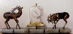 SCHATZ ELEXACTA ELECTRIC MANTLE CLOCK: Clock encased in a lucite case, pair of majestic deer on both sides, all on a two tier marble base. 13"h, 30"w. | 130 |