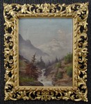 AGOSTINI, Guido, (Italian, 19th C): Alpine valley landscape, O/C, 16 1/2" x 13", signed lower right, encased in elaborate ornate Italian pierce carved gilded gesso frame with c scroll and foliate motif, 23" x 19 1/2" overall. Condition - Painting has heavy craquelier and canvas shrinkage in upper 2/3 causing a raised effect of the paint with virtually no paint loss, however. From the estate of Elton Hoyt II. | 550 |
