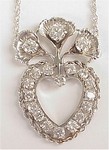 CHARMING 2.5ctw DIAMOND HEART NECKLACE: Sixteen round full cut diamonds set in heart shape pendant of 14k white gold topped by three foliate flares each centered with it's own round full cut diamond, average SI1-I1 in clarity and H-I in color, all diamonds prong set, approx. 2.5 carat total weight, fine rope chain attached to pendant (approx. 17"l.) Sold with August 2003 GIA gemologist appraisal, retail replacement value $4550** | 1,200 |