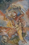 WATERMAN, Michael, (American, 20th C): Surreal scene of giant woman holding city over her head while standing over a floating man, O/C, 36" x 24", signed lower right, dated 86. | 250 |