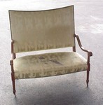 INLAID EDWARDIAN SETTEE: Tall settee with draped crest back. Curved arms with scrolled hand holds. Banded and inlay to the arms and legs. 47 1/2"h, 48"w. | 400 |
