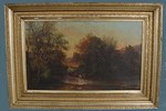 RONDEL, Frederick, ANA, (American, 1826-1892): Landscape with figures crossing a river, towing a hay cart with team of oxen and a horse, O/C, 18" x 30 1/8", signed lower right and dated 56?, encased in period American gilt gesso frame with minor gilt loss. Former property of Henry Tasker, Long Island, New York. The Tasker family has owned this piece for over 100 years, descended from former owner's great great grandfather. Condition - Painting in need of cleaning, several patches visible verso, sporadic minimal in paint visible with black light. Est. $4000/6000** | 13,000 |