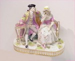 FINE MEISSEN PORCELAIN GROUP: Highly detailed man and woman on a settee. Professional restoration to gents hand. Cross swords mark. 8"h. 10"l. | 650 |