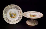 SAXONY FINE GERMAN PORCELAIN COMPOTES: Reticulated and hand painted border centering a courting scene. Cross sword mark with the letter T. 3 3/4"h, 6 1/2" dia. | 125 |