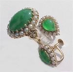 LADY'S JADEITE AND SEED PEARL RING & EARRINGS: Oval cabochon jadeite, approx. 5ct, slightly uneven translucent medium tone with strong saturation of imperial green color; surrounded by eighteen 2.25mm round pearls of white to silvery white color with moderate luster, all prong set in 14k yellow gold. Sold with matching screwback earrings. | 250 |