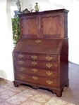 KITTINGER COLONIAL WILLIAMSBURG SECRETARY BOOKCASE: Slant front mahogany secretary with short bookcase top. Bookcase top has scalloped door panels, it is removable and fits into lower section with molding on three sides, interior has adjustable shelf. Lower section has four drawers in graduated sizes, carved shell skirt. Interior with 9 drawers and 4 open cubicles. Key locking with 2 keys. Drawer branded "Kittinger" and "Williamsburg Restoration". 5' 1/2"h. 49"w., 20 1/2" deep. | 3,750 |