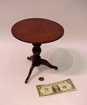 MINIATURE EXAMPLE OF A TILT TOP TABLE: Walnut table with turned pedestal on 3 splayed legs. 7 7/8" dia. 8"h. Please note repairs to the legs. From the estate of Elton Hoyt II. | 110 |