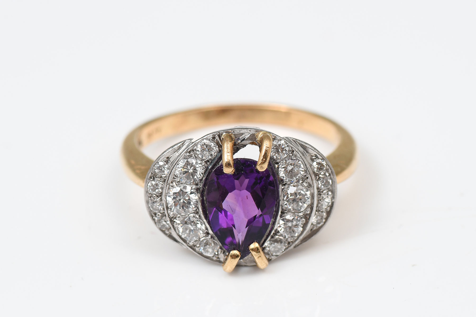 18K AMETHYST AND DIAMOND RING: 18K yellow gold ring contains 18 round brilliant cut diamonds. WEIGHT: .50 Ct. Approx. Rated VS in clarity and G-H in color. 1 pear faceted amethyst. WEIGHT: 1.00 Ct. Approx. The amethyst and diamonds are prong set. Weight: 5.4 grams. Size: 7.5