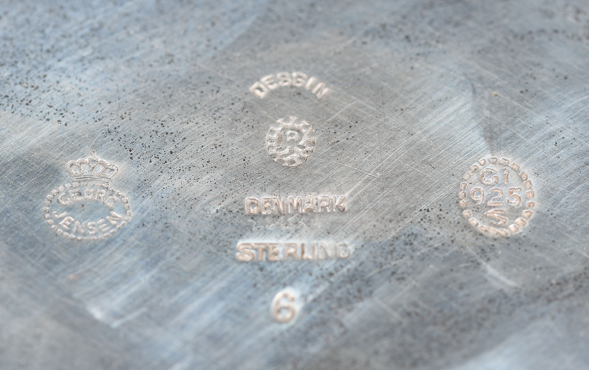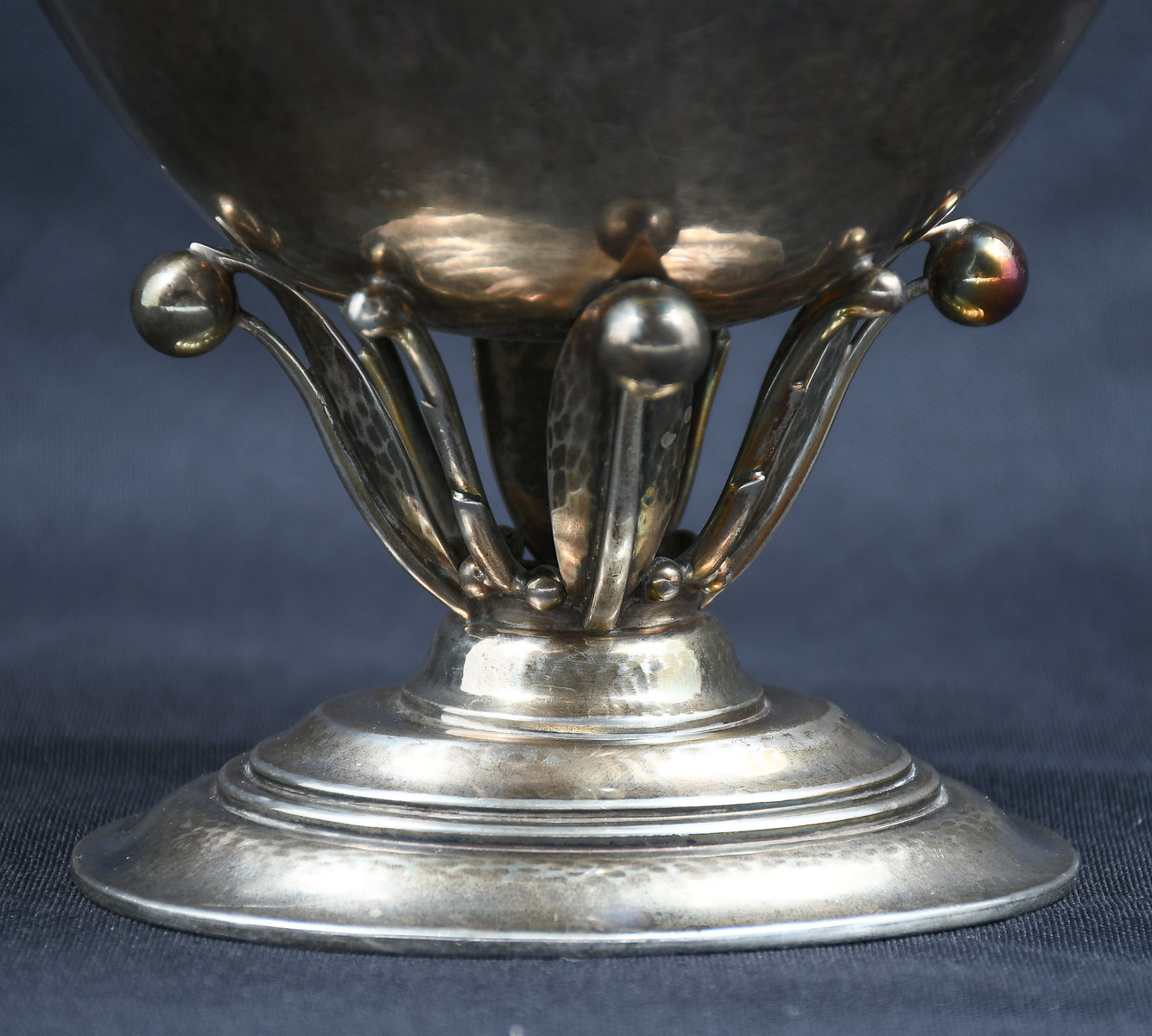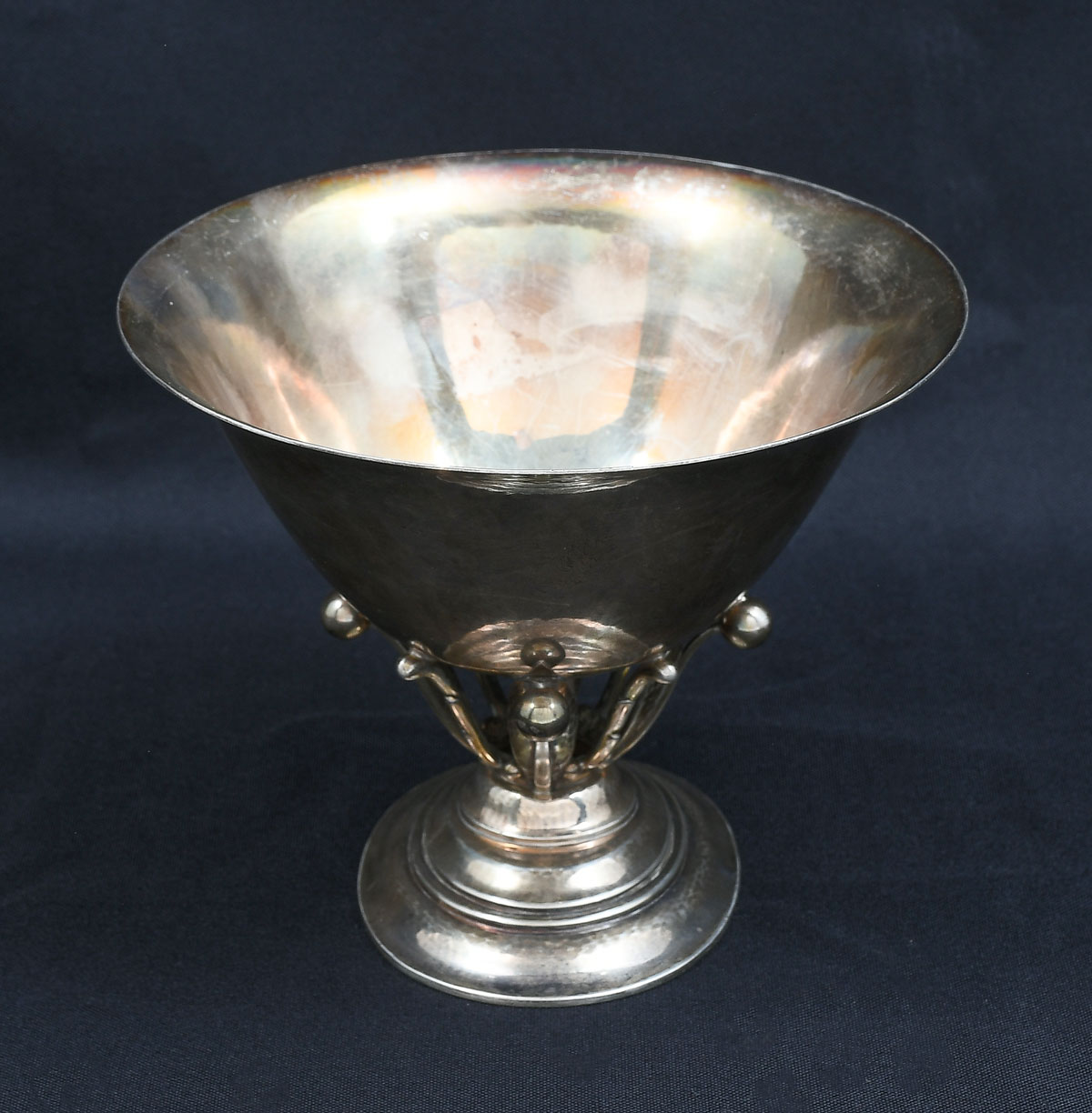 GEORG JENSEN/DESSIN STERLING COMPOTE: Approx. 12.20 Troy ounces. Denmark, 1915-1927, designed by Harald Nielsen, circular bowl, pedestal base with blossom decoration, marks for Georg Jensen. Approx. 5.25'' h x 6.5'' dia.