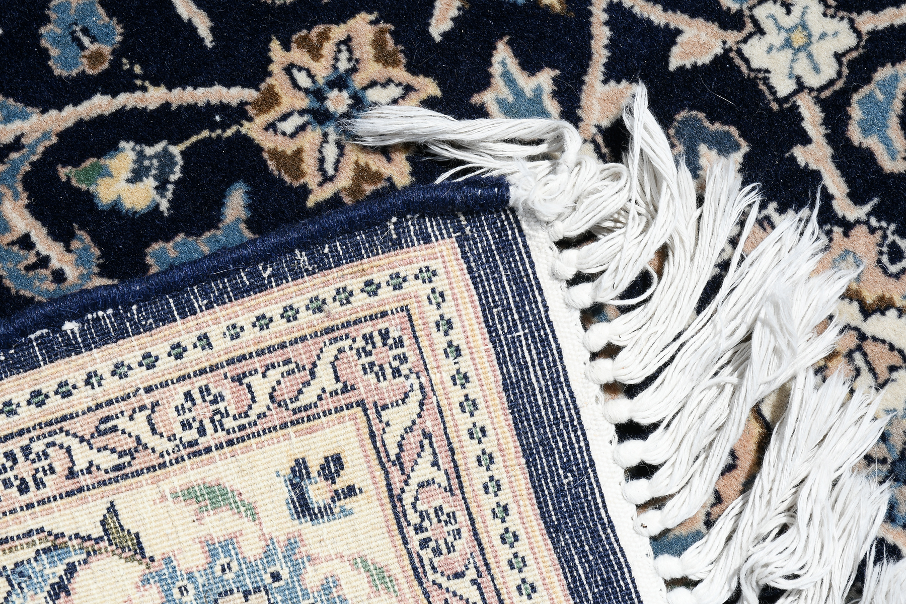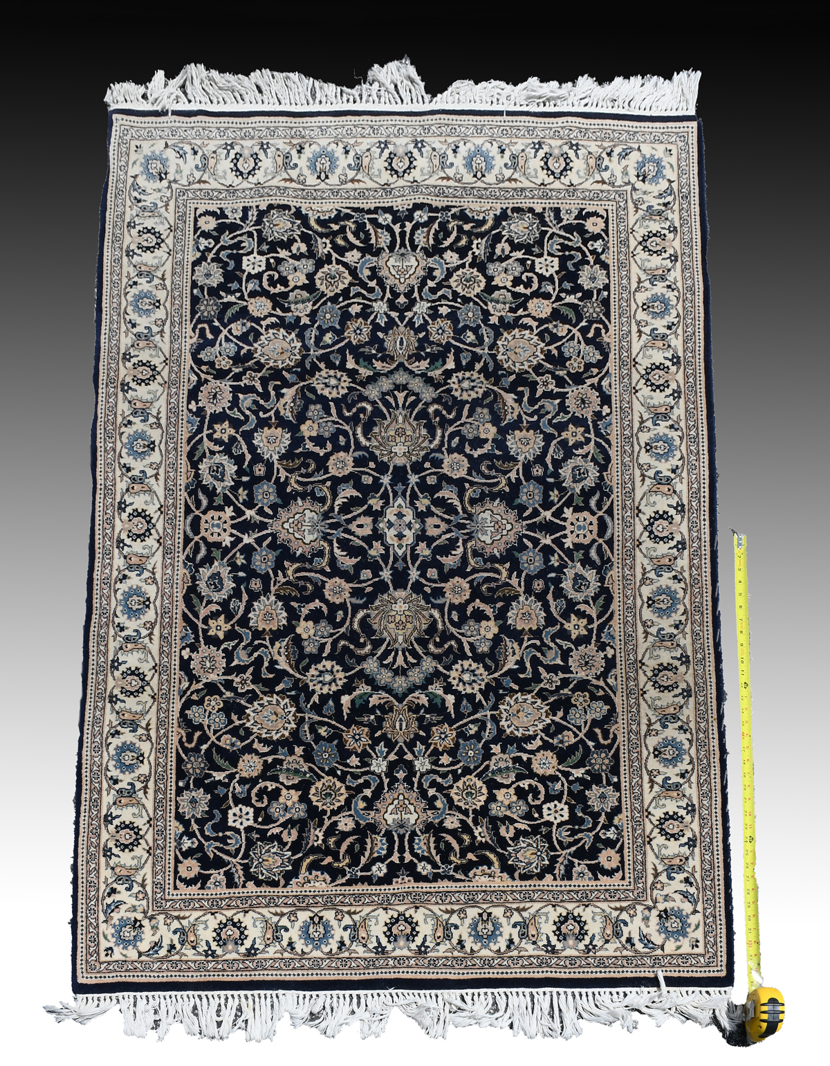 SINO PERSIAN HAND KNOTTED WOOL RUG, 4' X 6'2'': A pattern of flower heads and palmettes linked by vines covers the deep blue field.