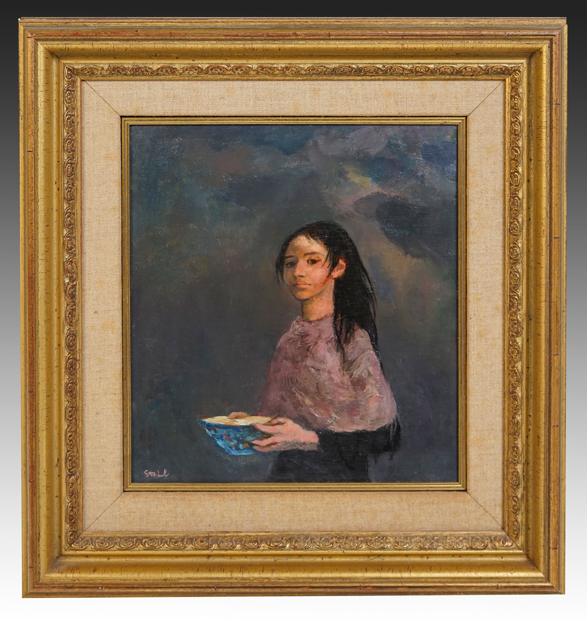 STAHL, Benjamin Albert, (Mexican/American, 1910-1987): Young Brunette Beauty Holding a Bowl, Oil/Board, sight size 12'' x 11'', signed lower left, framed, 19'' x 18''. Consignor's family was personal friends with the artist.
