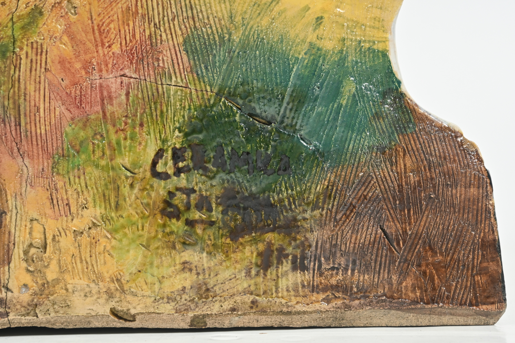 CONDITION: Repair at one finger with loss. Traditional kiln fire imperfections.