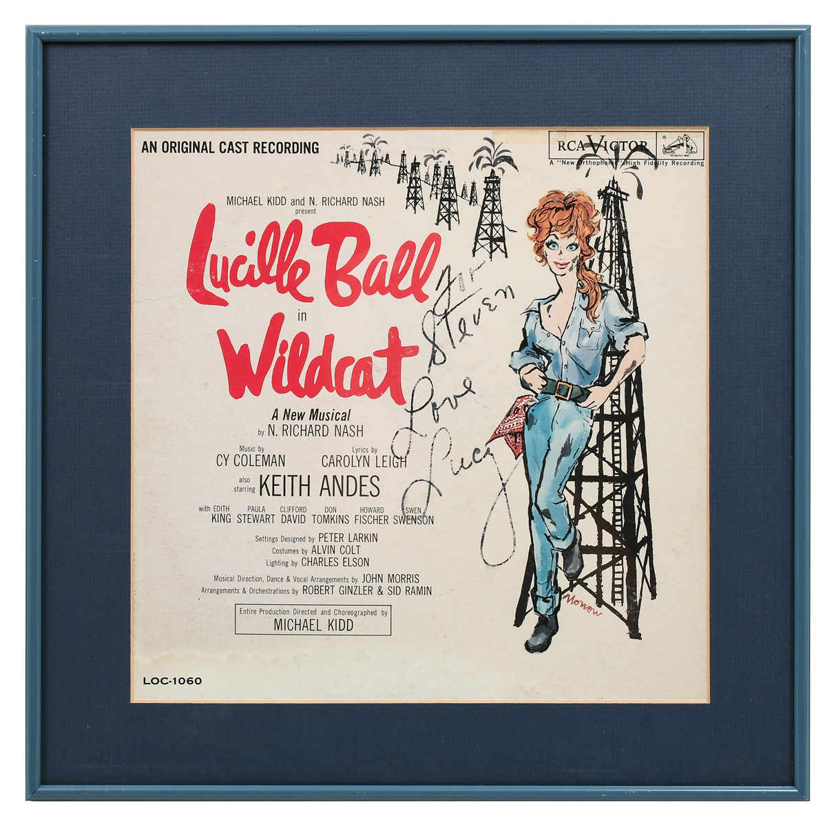 SIGNED ''WILDCAT'' ALBUM COVER BY LUCILLE BALL: Framed, 16'' x 16.25'', Dedicated to Steven, love Lucy. As is condition.