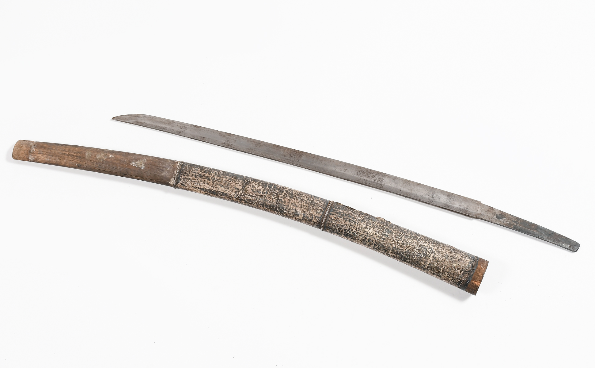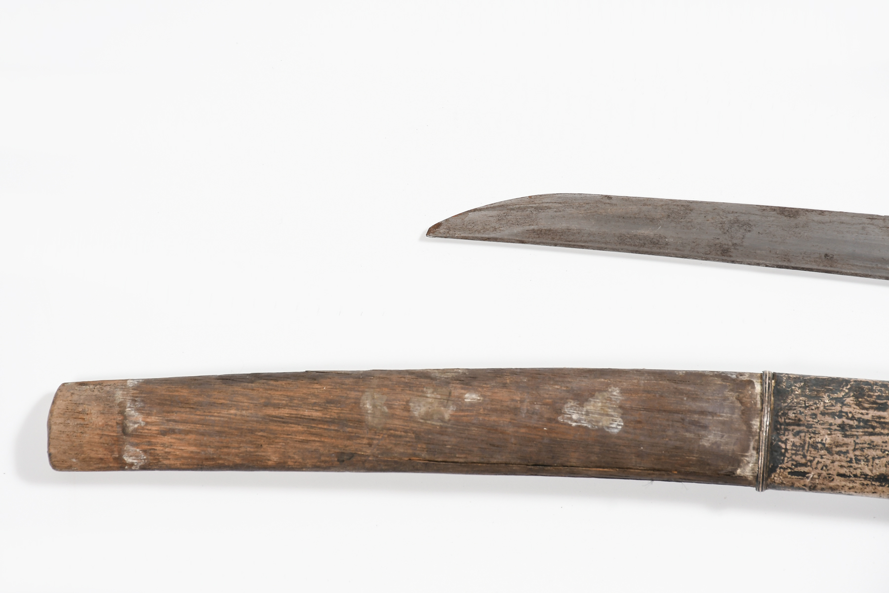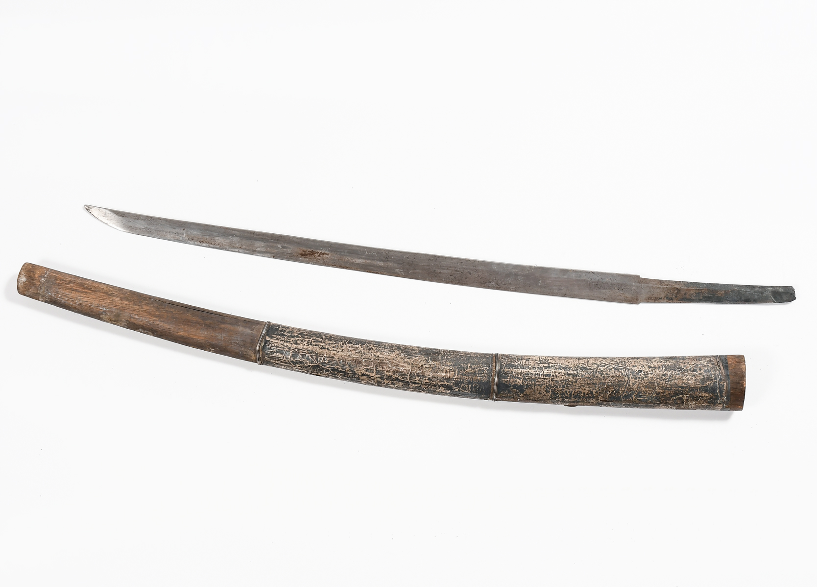SMALL JAPANESE SWORD/KNIFE POSSIBLY EARLY SIGNED?: With wooden scabbard, blade measures 17'', full length 21.5'', As Is condition.