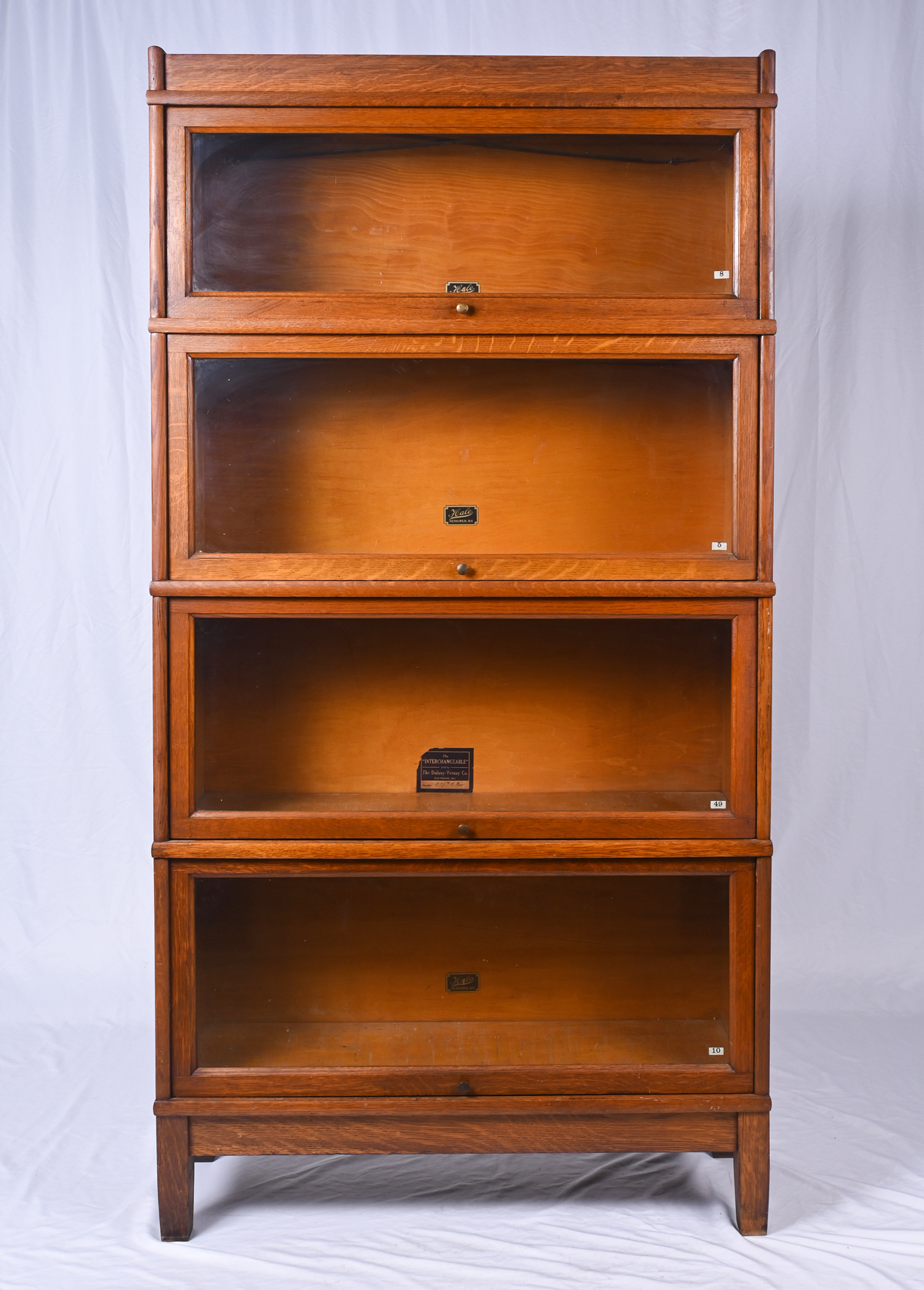4 STACK OAK HALE BOOKCASE: Top case is 11.5'' h, resting upon three 13.5'' h cases. All with original stickers at the interiors. Approx. 65.5'' h x 34.25'' w x 11.25'' d.