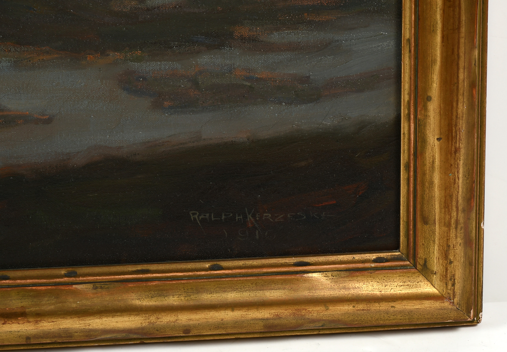 KERZESKE, Ralph Job, (American, 1884-1974): River Scene, possibly the Allegheny near Pittsburg, Oil/Canvas, 28'' x 36'', signed lower right and dated 1910, original gilded frame, 32.5'' x 40.5''.