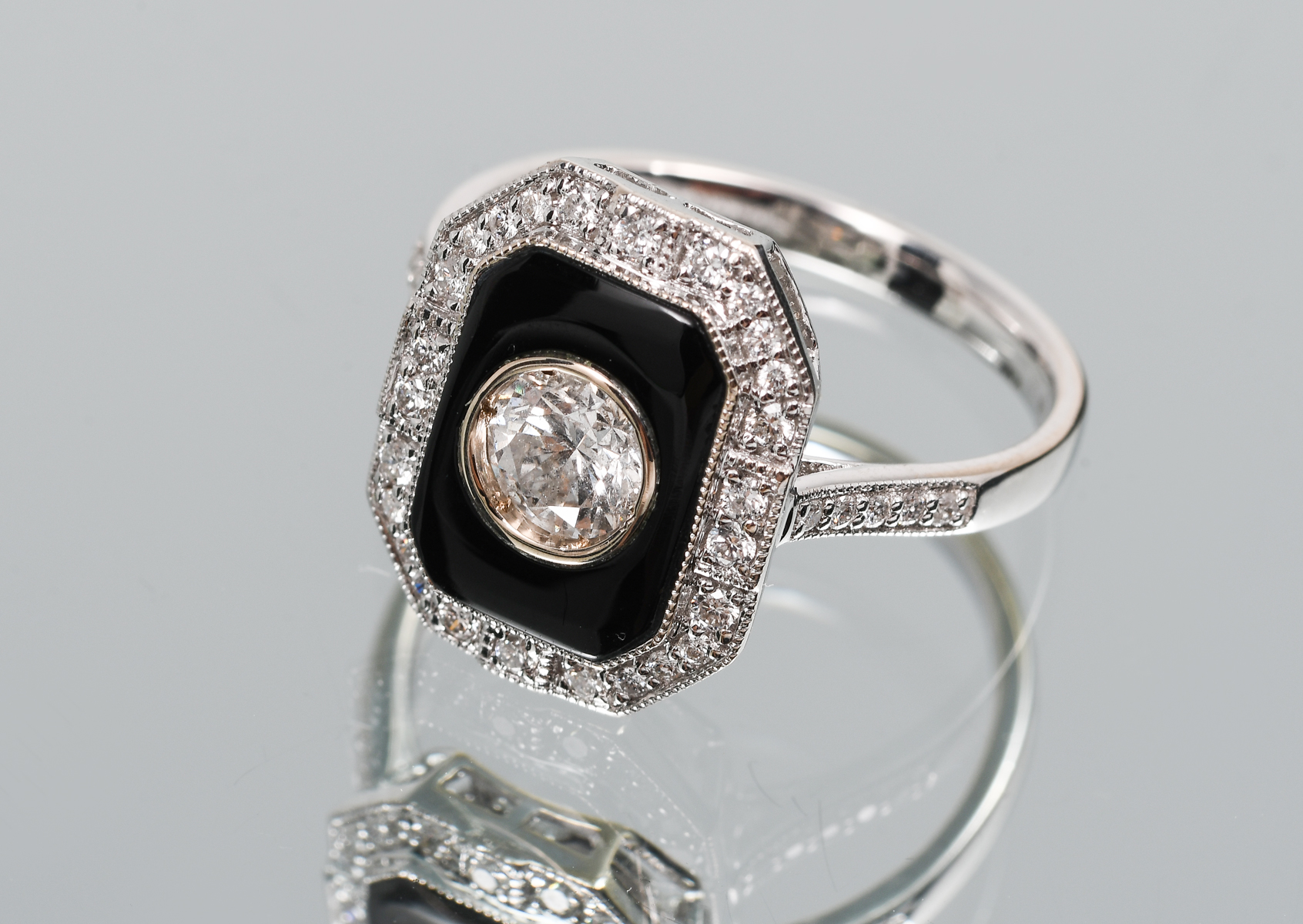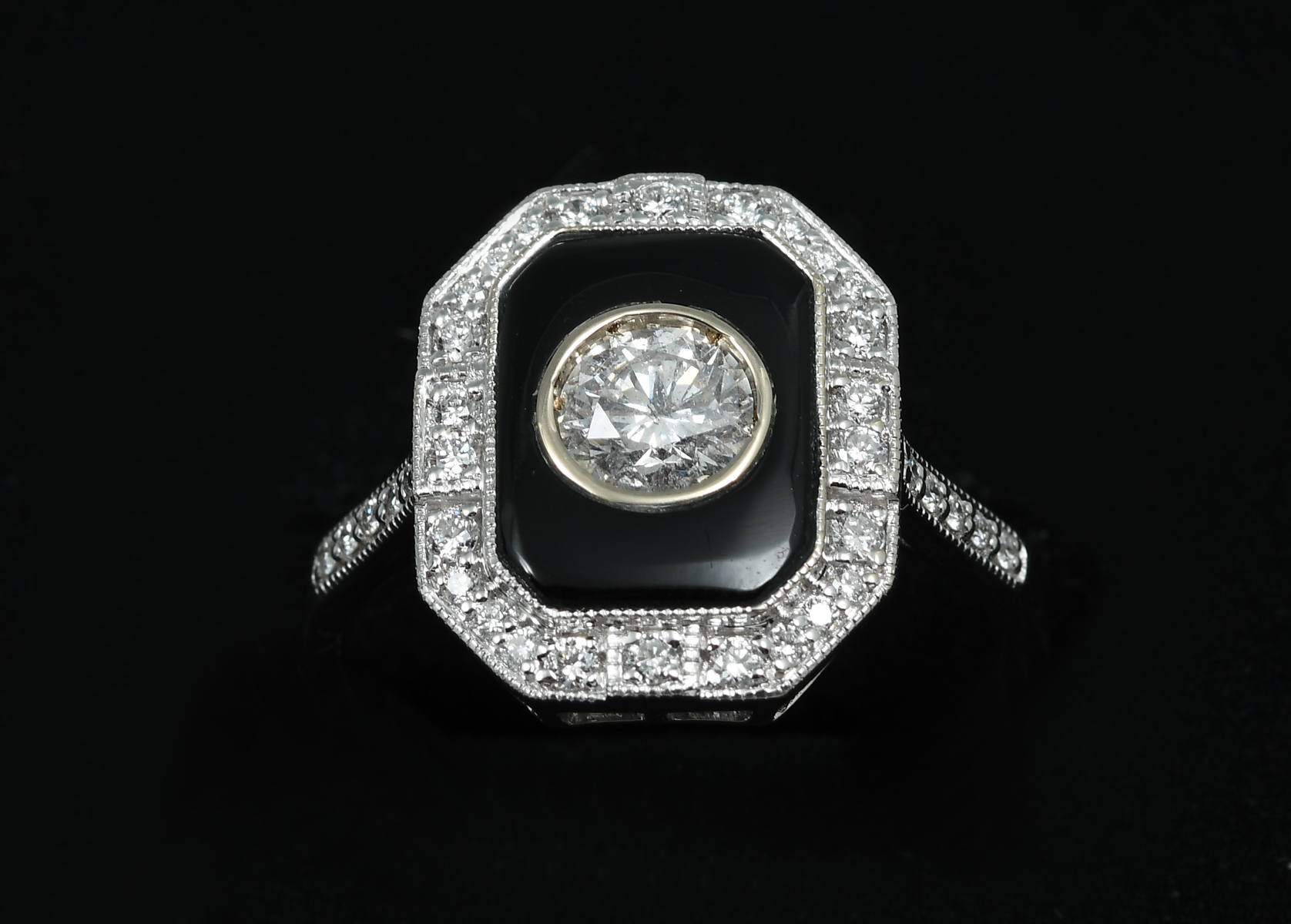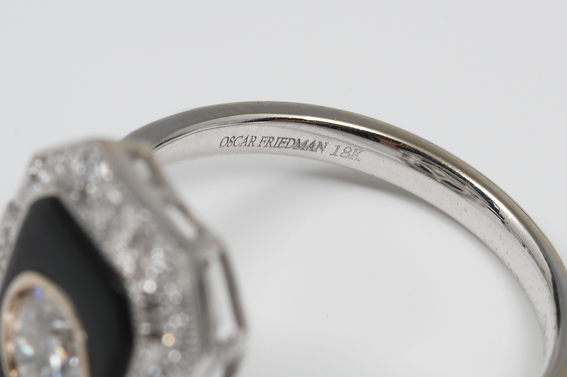 18K DIAMOND & BLACK ENAMEL RING BY OSCAR FRIEDMAN: .50 CT diamond is bezel set in the center of a rectangular tablet of black onyx. 36 round brilliant cut diamonds frame the tablet and cascade down the shoulders all set in 18K white gold. Total diamond weight approximates .74 CTW. Size 6.75. Signed Oscar Friedman. Total weight 4.5 grams. Sold with current Florida Diamond Appraisers GIA graduates appraisal for $3000.