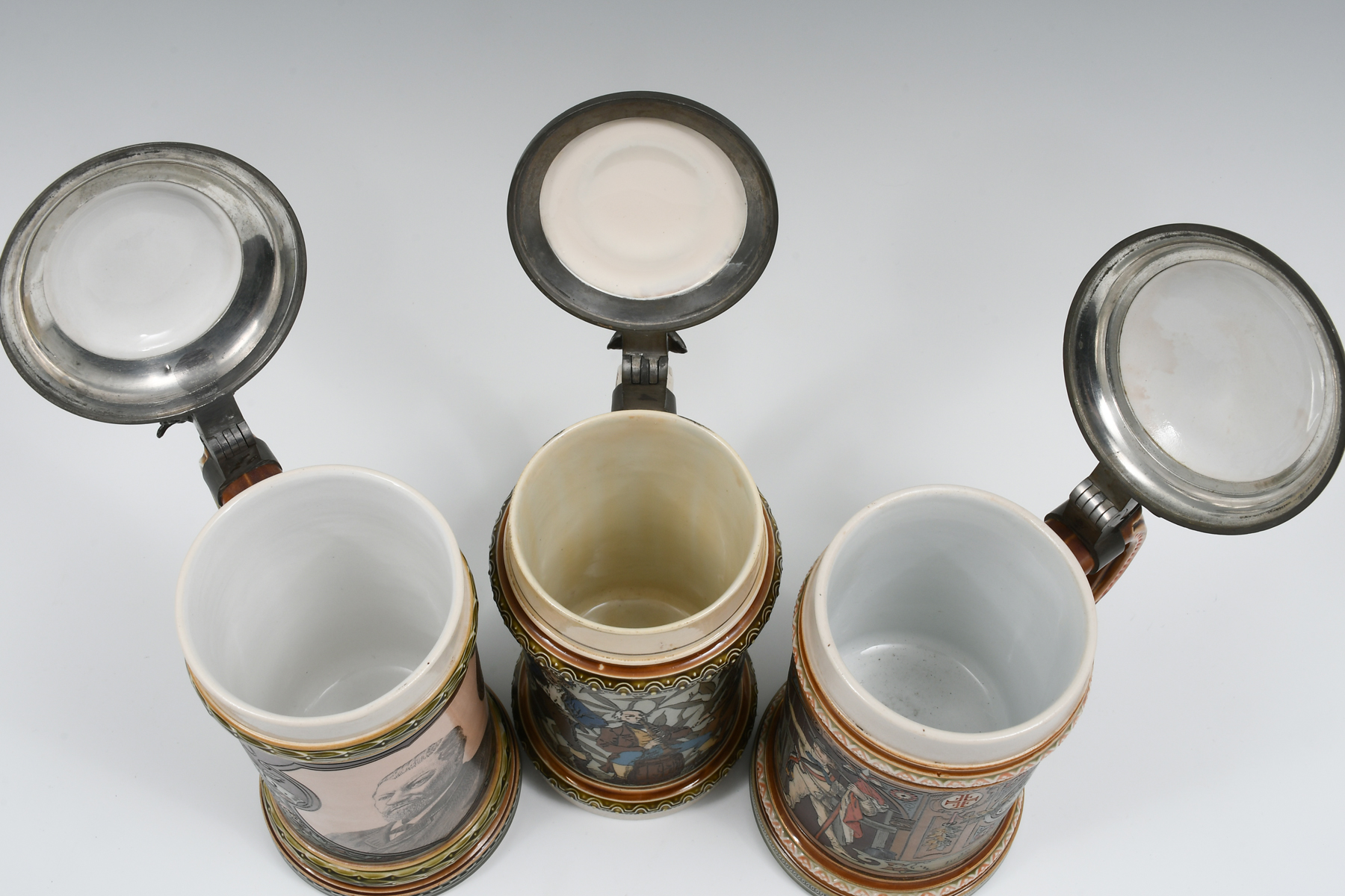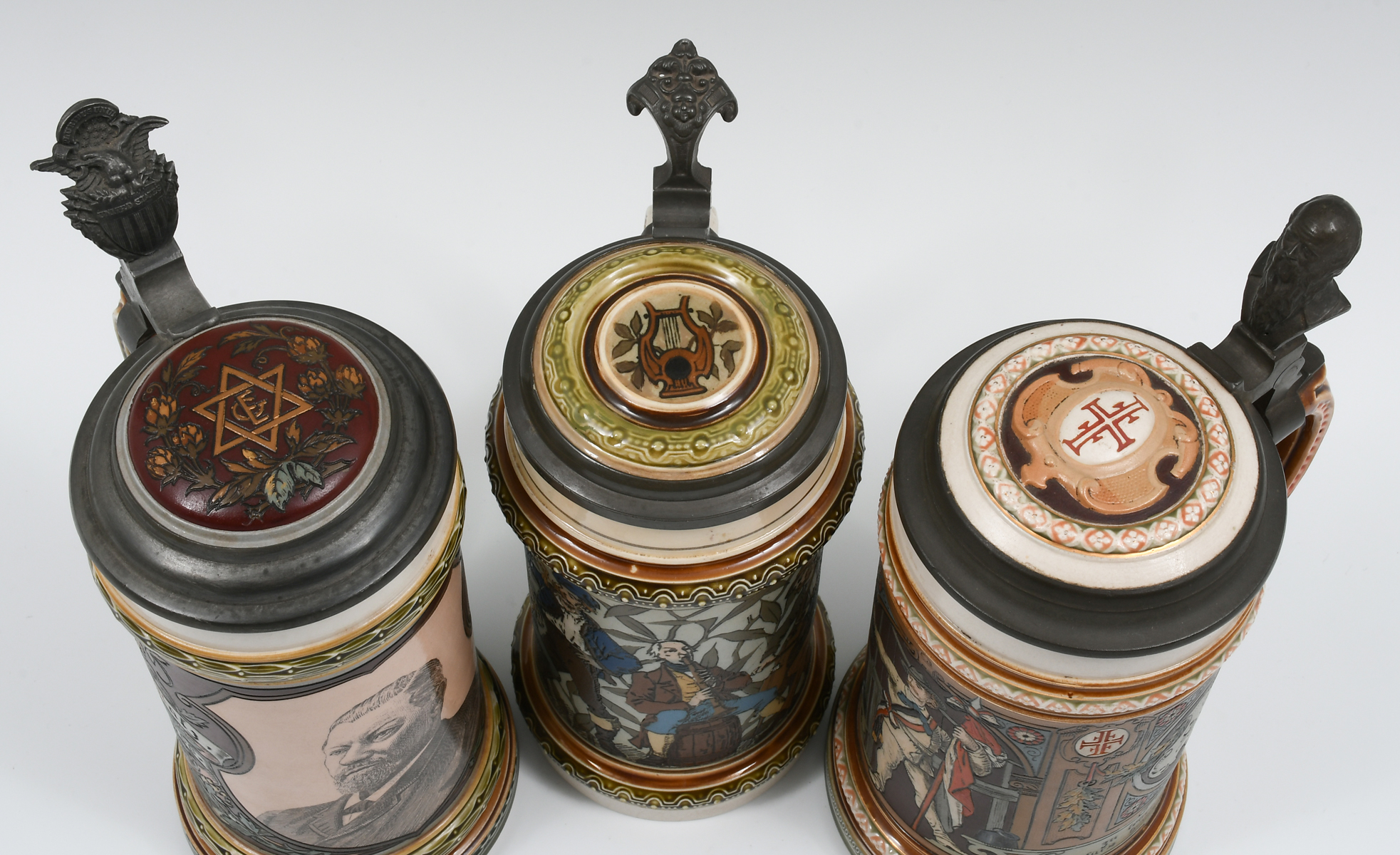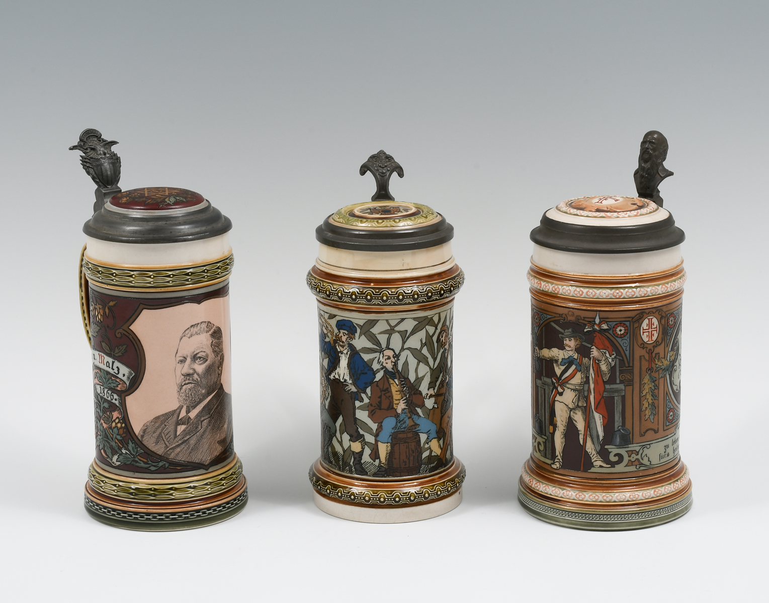 3 PC. METTLACH FIGURAL BEER STEINS: Comprising; 1- Mettlach #1163, .5L., having Musicians, 1888. 1- Mettlach #1914, .5L., 4F Turner scene, 1897. 1- Mettlach #1997, .5L., having a portrait of George Ehret, whom was Brewer. Signed Hein, 1890. Largest Approx. 9'' h x 5.5'' l x 4'' w.