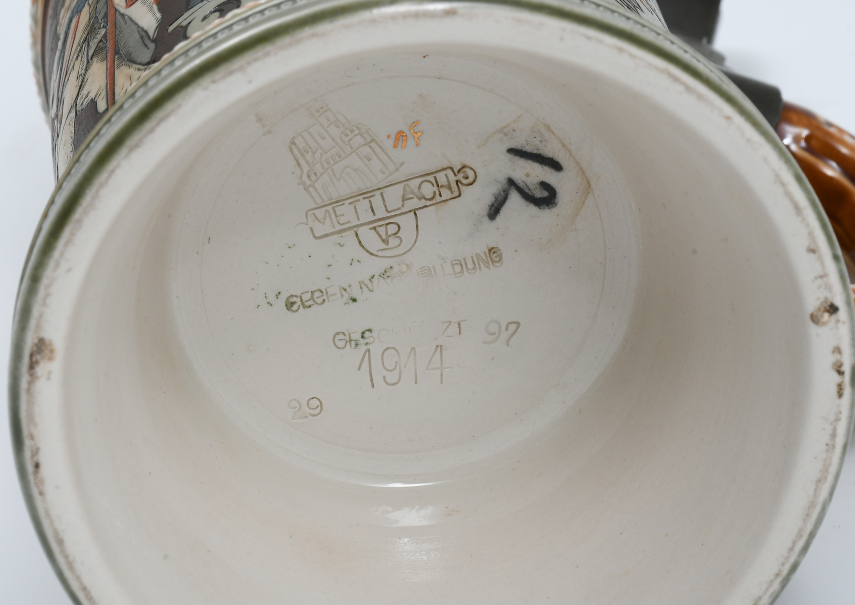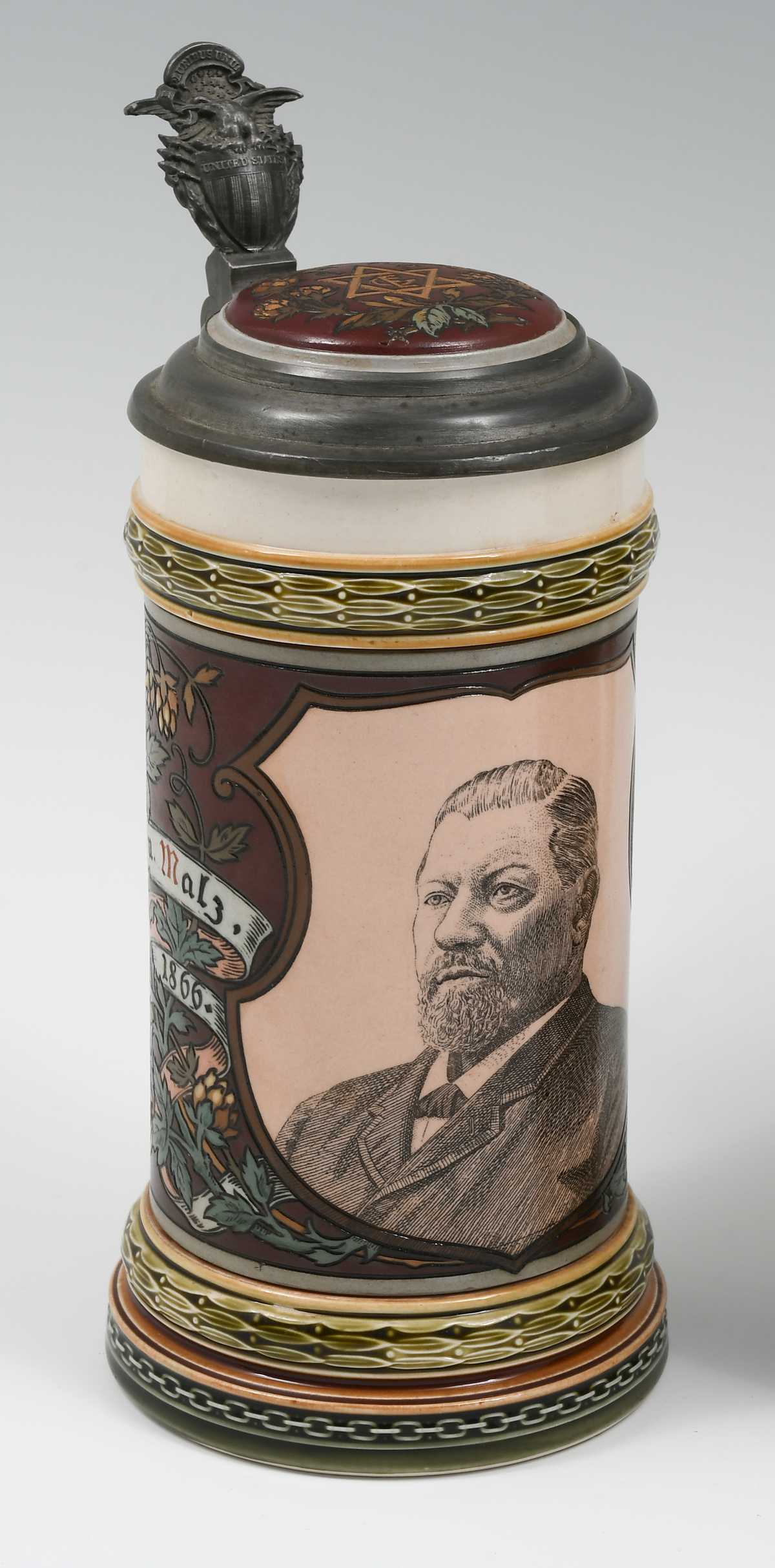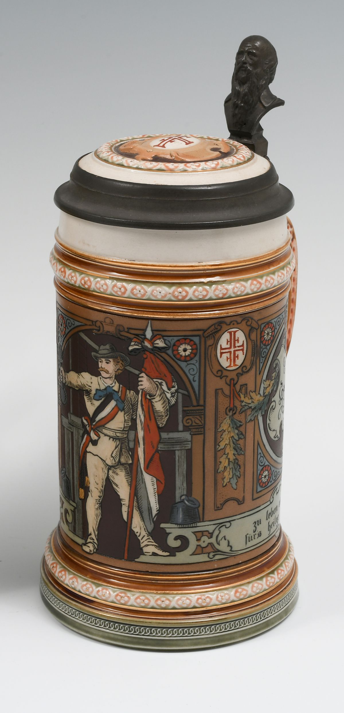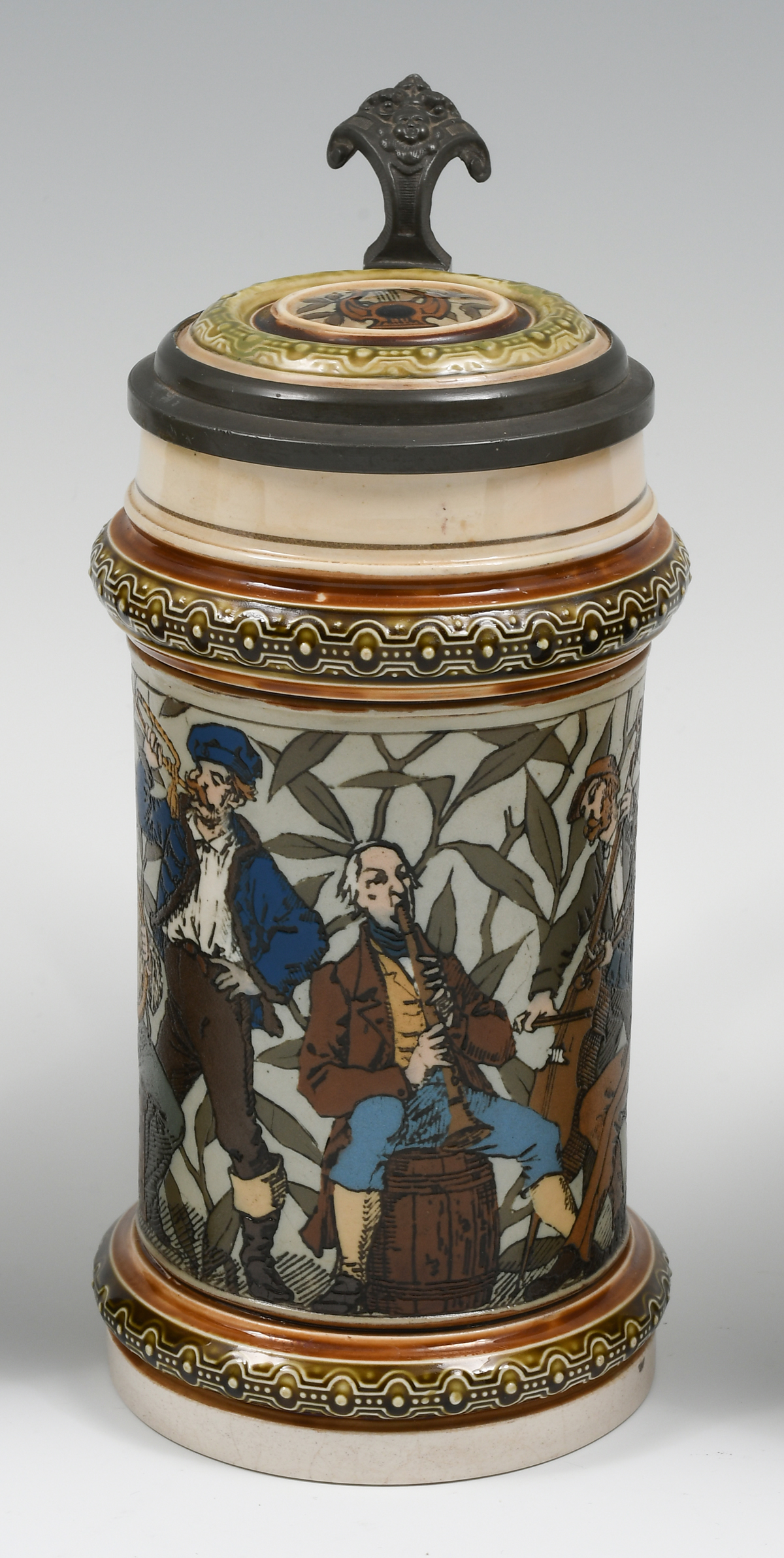 3 PC. METTLACH FIGURAL BEER STEINS: Comprising; 1- Mettlach #1163, .5L., having Musicians, 1888. 1- Mettlach #1914, .5L., 4F Turner scene, 1897. 1- Mettlach #1997, .5L., having a portrait of George Ehret, whom was Brewer. Signed Hein, 1890. Largest Approx. 9'' h x 5.5'' l x 4'' w.