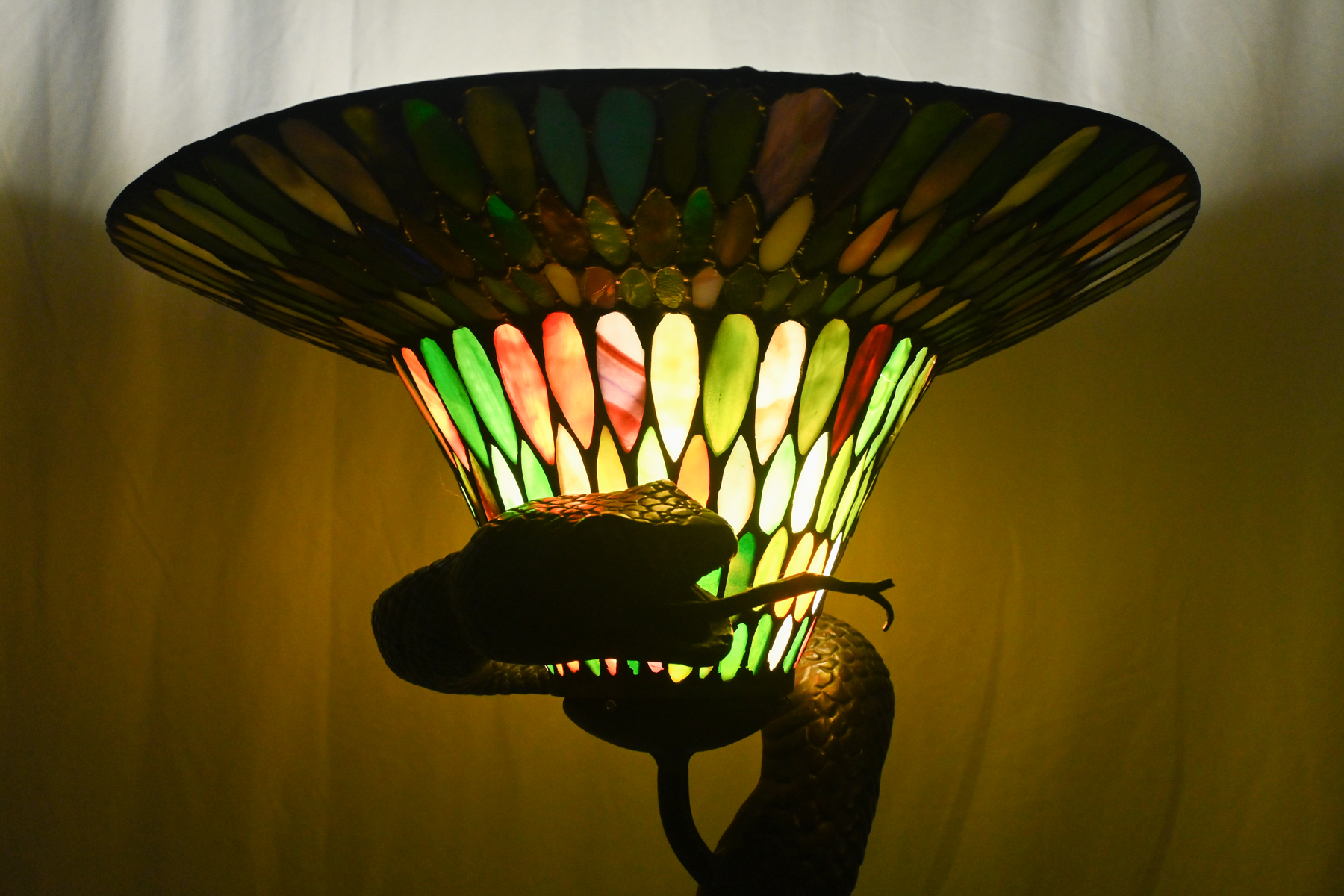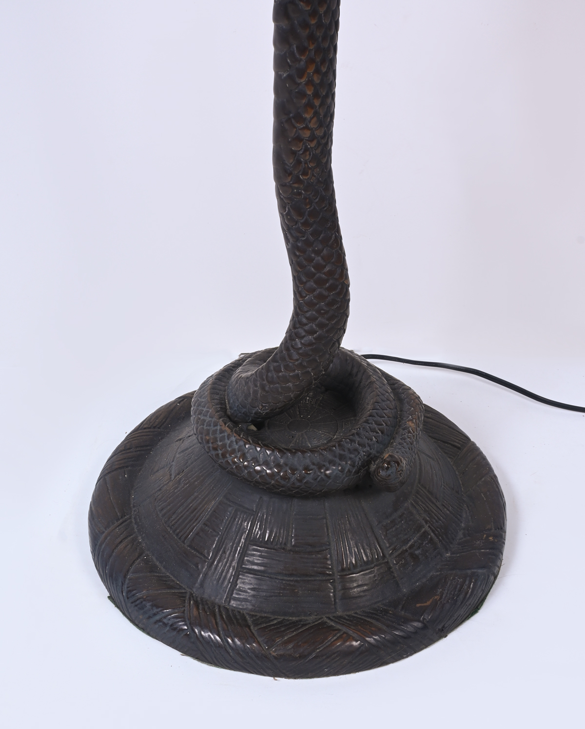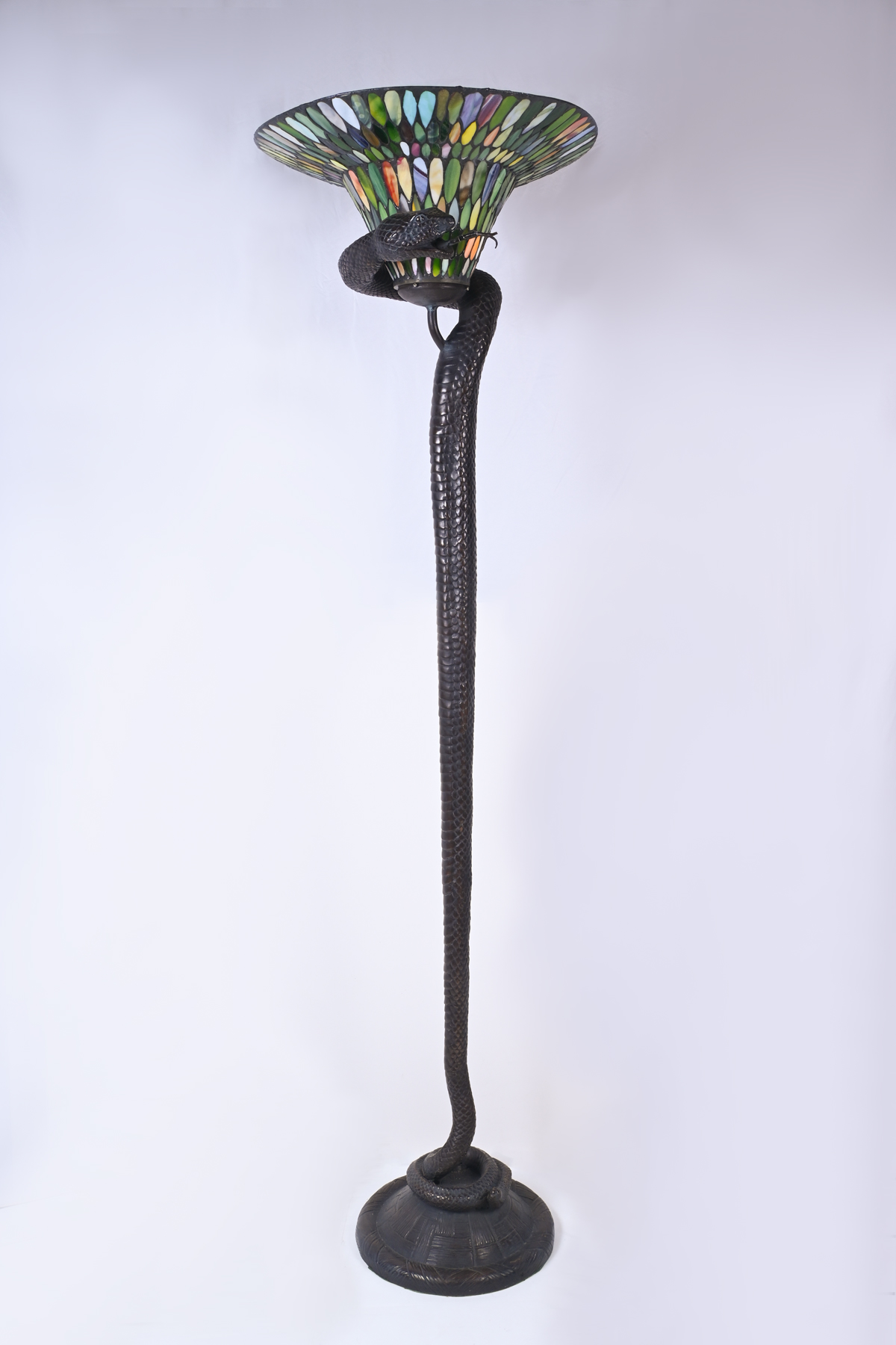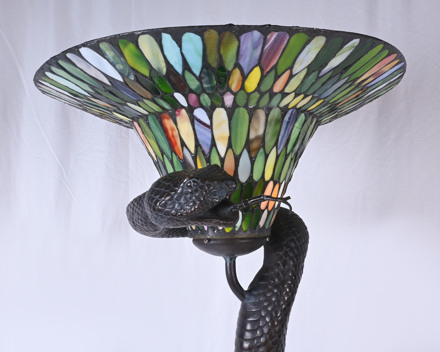 MODERN SNAKE FORM STAINED GLASS FLOOR LAMP: In the manner of Edgar Brandt (1880-1960) 'La Tentation', an Art Deco influence floor lamp in the form of a patinated bronze snake rising from a circular basket weave base, the head with open mouth cradling a modern leaded glass shade with single socket. Approx. 68.25'' h x 19.5'' w.