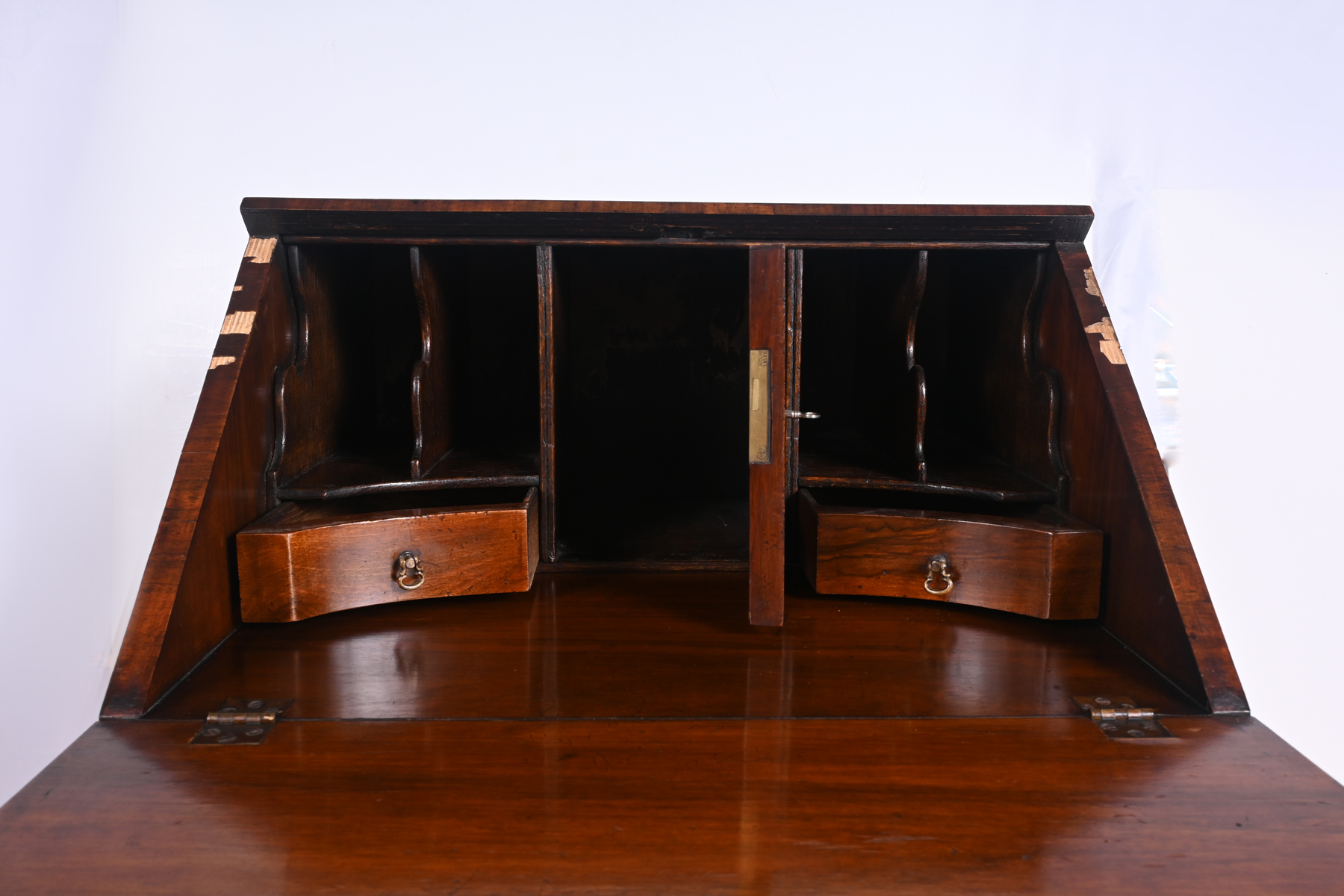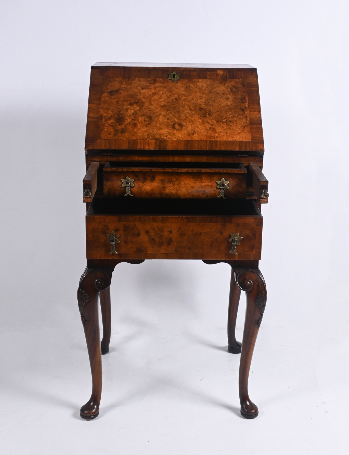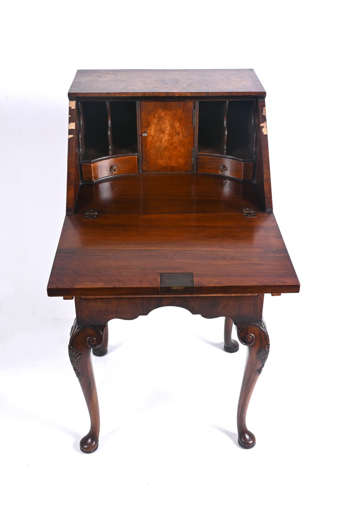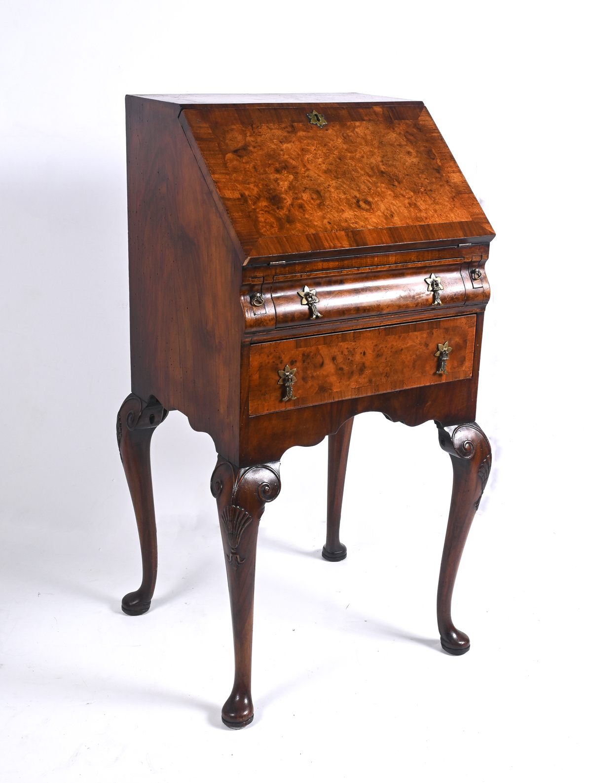 QUEEN ANNE STYLE DROP LID EXOTIC BURLWOOD SECRETARY: Compartmented slant front desk with two pull-out supports, over two drawers. Raised on cabriole legs with scrolling knees and Dutch Club feet. Approx. 36.75'' h x 19.5'' w x 17.5'' d.