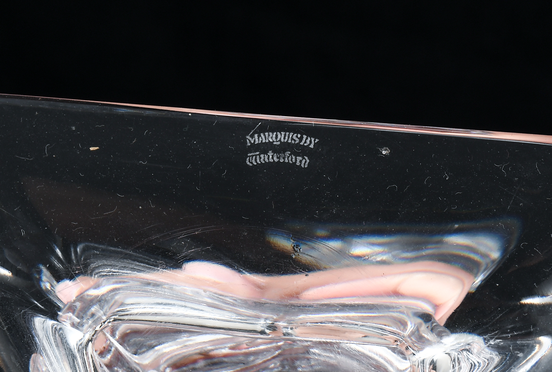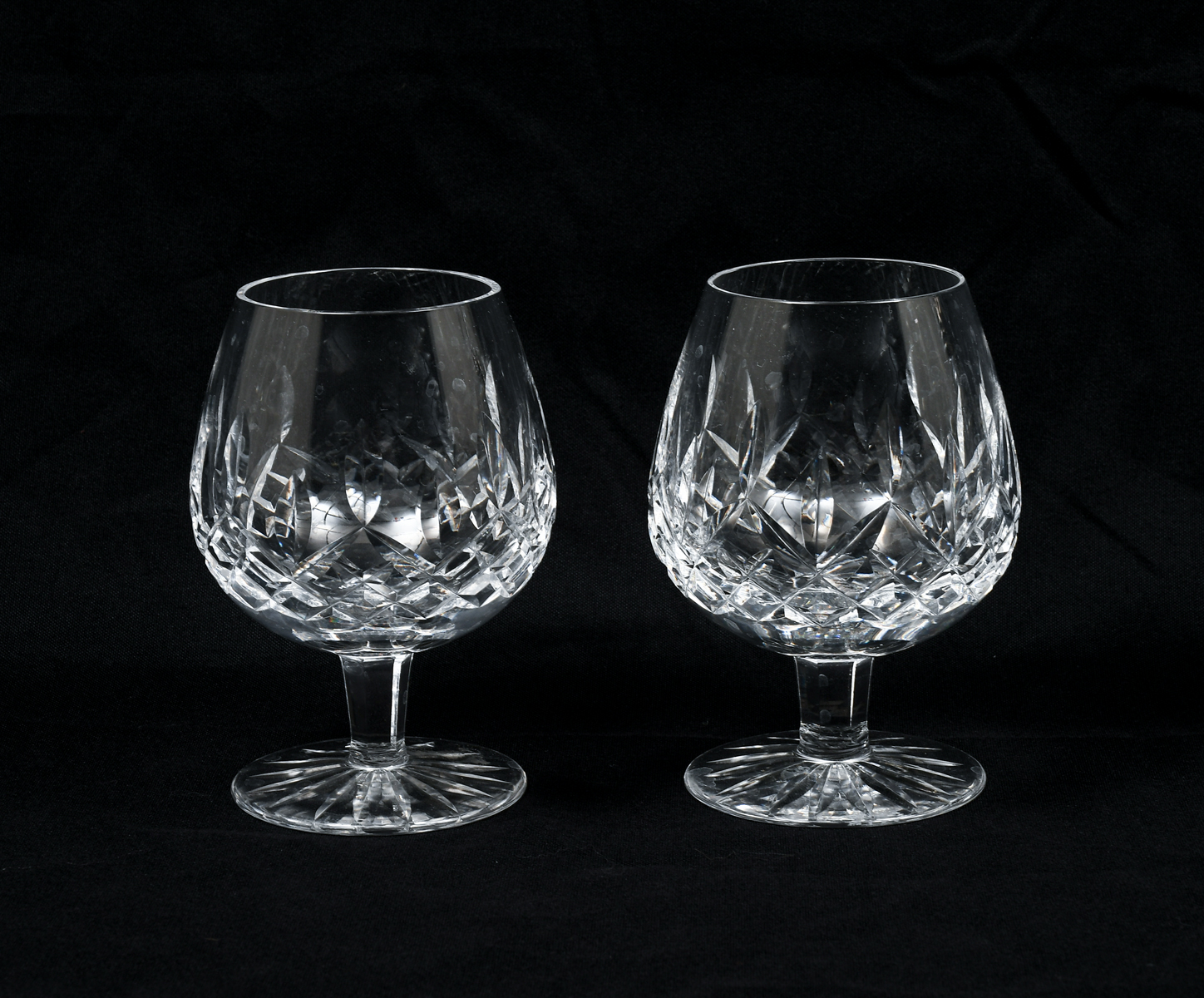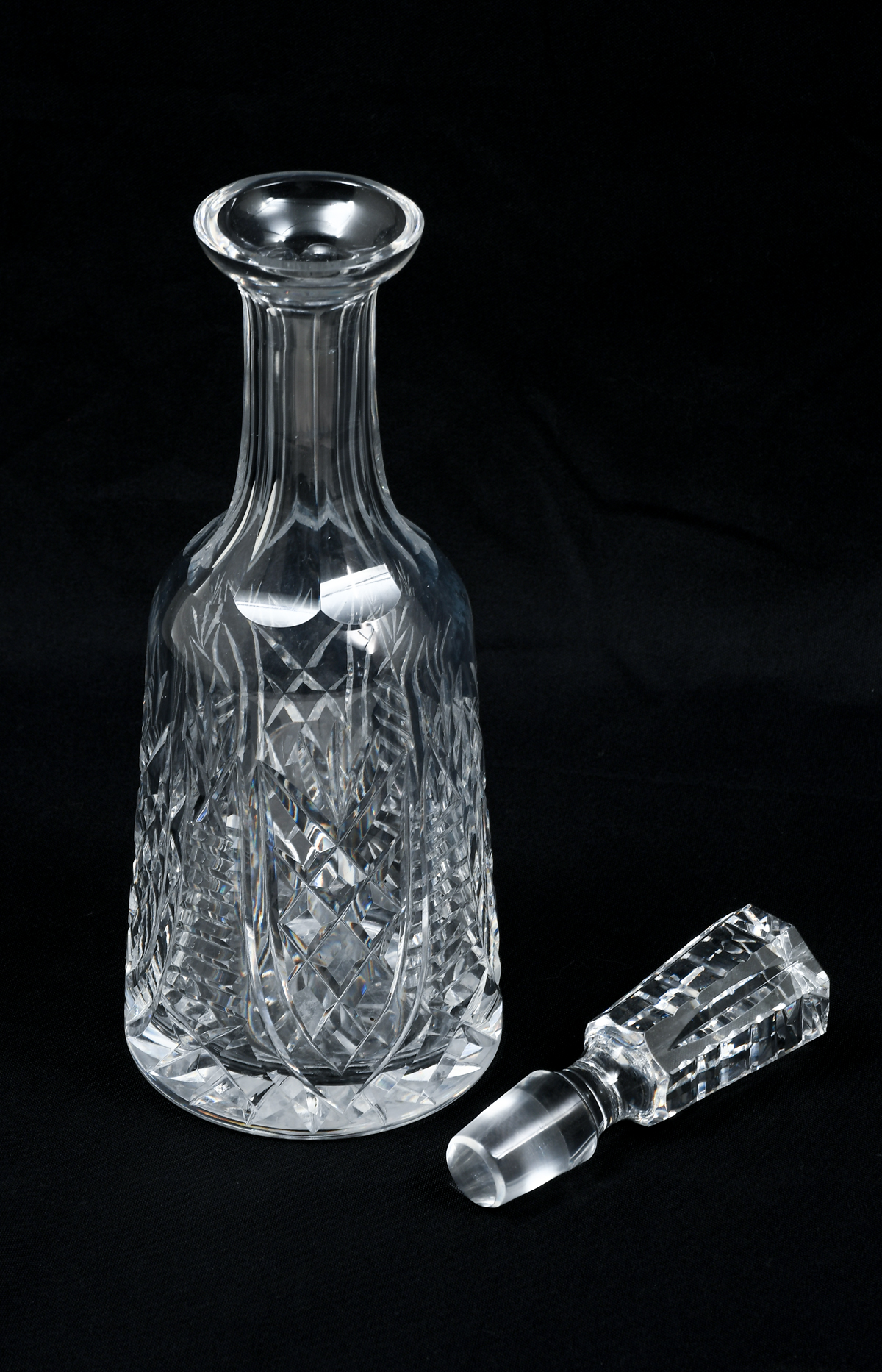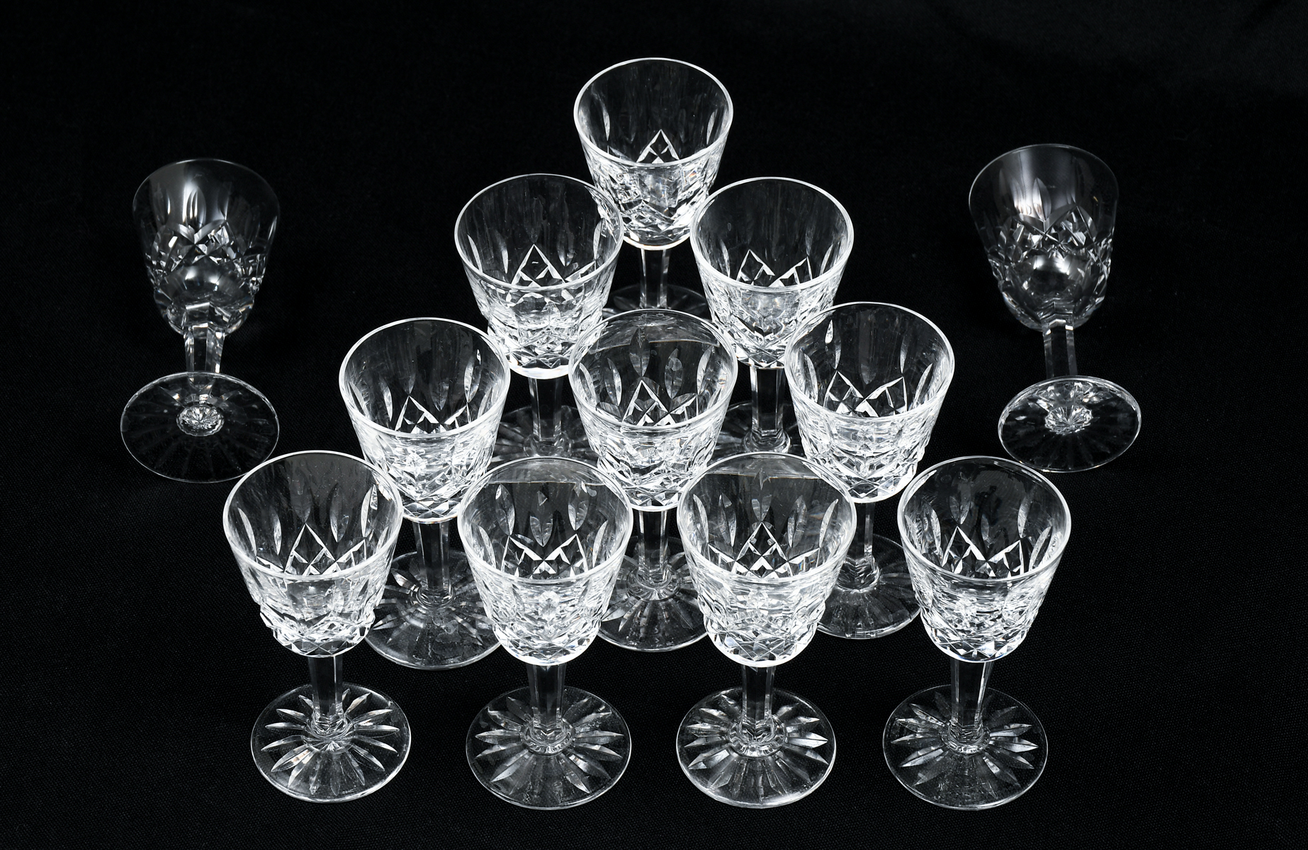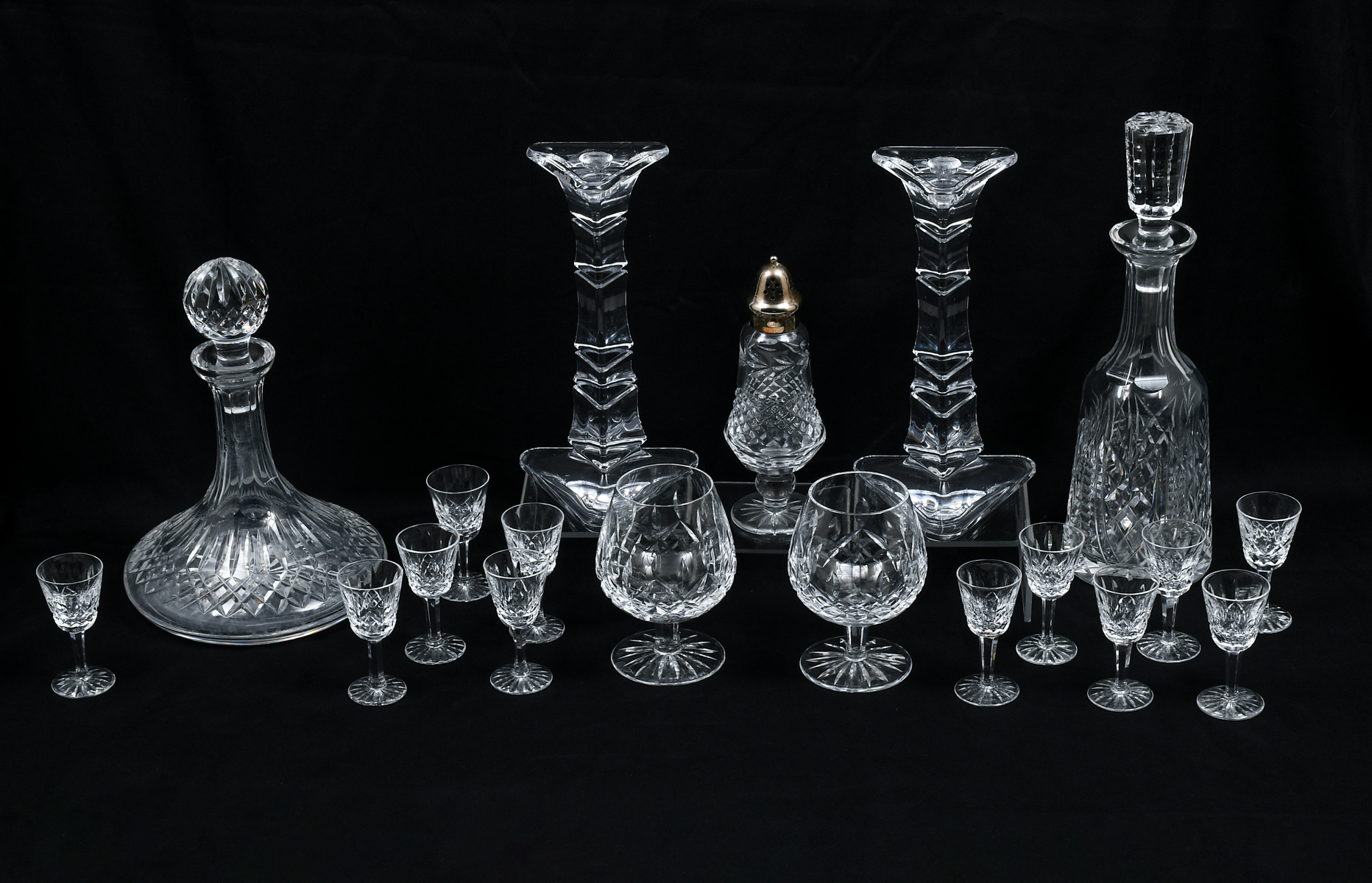 19 PC. WATERFORD COLLECTION: Comprising; 2- Decanters, 2- Cognac Snifters, 1- Powdered Sugar shaker, 2- Candlesticks, & 12- Cordials. Various patterns with Lismore included. Largest Approx. 13.25'' h x 4.25'' w.