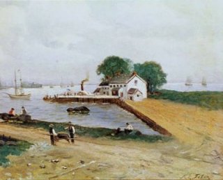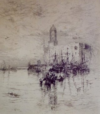 MORAN, Thomas, (Santa Barbara, CA, 1837-1926): Scene of Vera Cruz Harbor, Mexico, etching, 16 3/4" x 14", monogrammed in the plate, laid down to mat, staining, slight foxing, slight tear to lower right corner. Estimate $400.00-$600.00. |