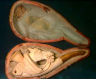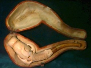 CARVED MEERSCHAUM, FALCON'S CLAW PIPE: With amber stem & original case, 4 1/2" in length. |