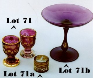 HIGH BIDDER'S CHOICE OF ART GLASS: Choice of three includes Sandwich Glass footed dresser jar, spangled glass low bowl w/gold stone flecks or Cluthra type art glass lamp. |