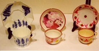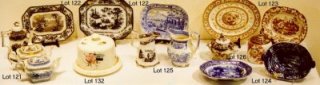 CHILD'S LUSTER TEA SET: Sold along with porcelain miniatures and child's pressed glass sugar bowl and tumblers. |