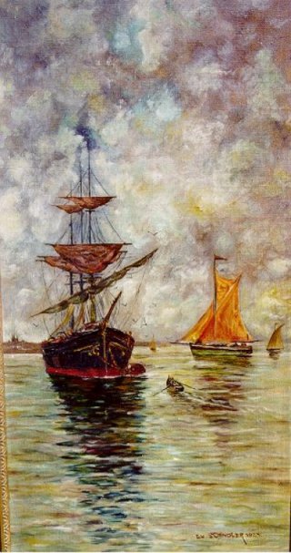 HIGH BIDDER'S CHOICE: NEWARK, W.(Wilber?) le Roy (American, 20th C.): Ship at Full Sail, O/M, 24" X 30", SLR. And a second work also attributed to Newark: Galleon at Sunset, O/B, 24" X 27 1/2", unsigned. Estimate (each): 200.00 - 400.00. |