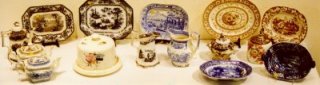 TRAY LOT TO INCLUDE HEISEY GLASS, FLO BLUE, and NILOAK POTTERY: |