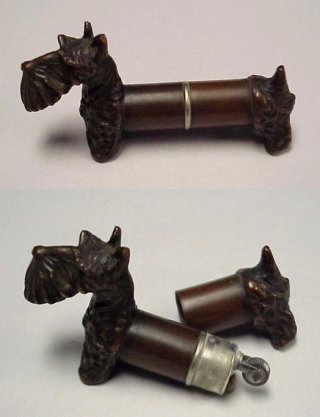 SCOTTIE DOG LIGHTER: Bronze tone Scottie with pull apart elongated body, in working order, 1 1/2"h. x 3 1/4"l. Made in U.S.A. |