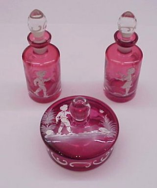 CRANBERRY COCKTAIL PITCHER AND 6 ROLY-POLY TUMBLERS: Etched leaf design. |